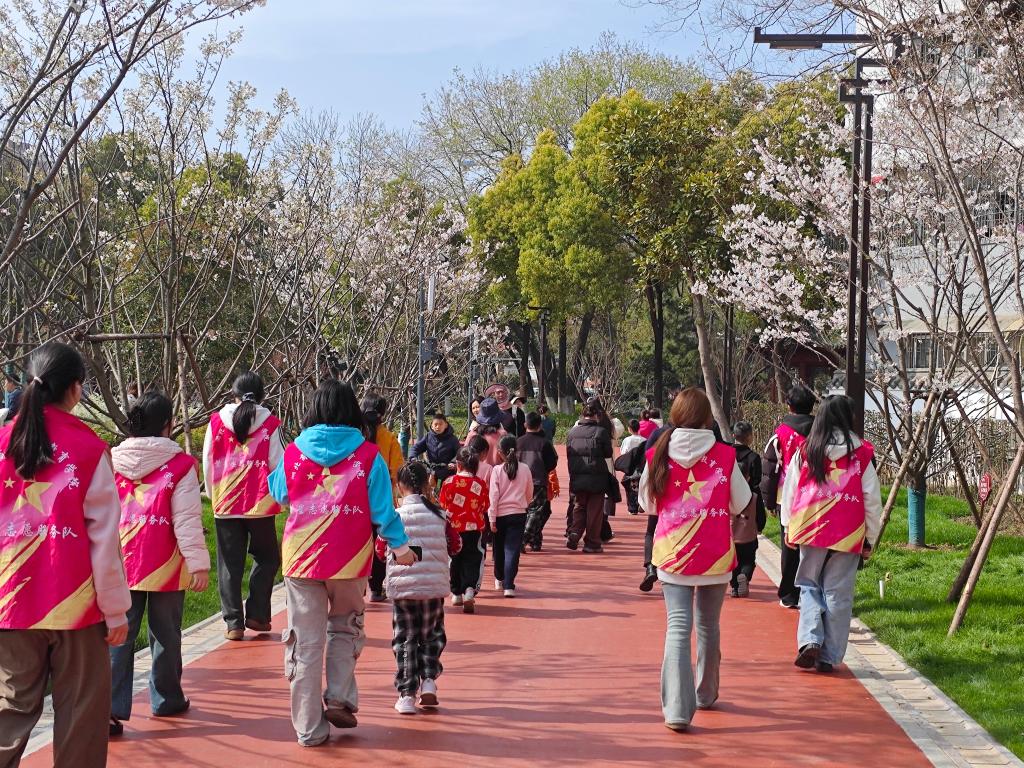 在“樱花漫步赏春”环节,志愿者们与园方负责人一同带领孩子们徜徉于樱花大道。春风吹拂,花瓣纷飞,孩子们穿行于花树之间,眼中映满春的色彩。志愿者们牵着小朋友的手,耐心引导他们观察樱花的形态与色彩,用目光记录下春日里最美的瞬间。一张张笑脸在樱花树下绽放,欢声笑语回荡在林间小径。