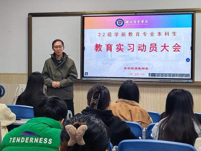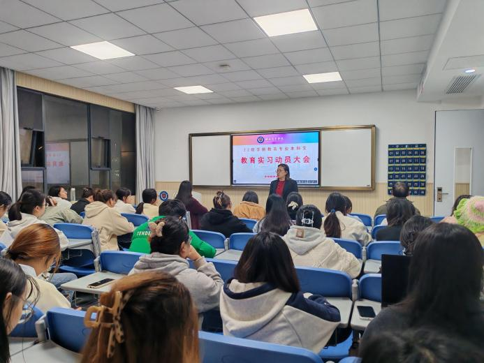 武汉校区动员大会于10 月 30 日晚 6:30 正式举行,教育学院副院长金敏、教研室主任郝一双、副主任张俊南及教师董洁出席会议。会上,金敏发表动员讲话,着重强调教育实习是学前教育专业学生成长的“关键一课”。他指出,实习是实现理论知识向实践能力转化的核心环节,寄语同学们在实习中深耕专业基础、锤炼教学技能,为未来投身教育事业积累扎实经验。