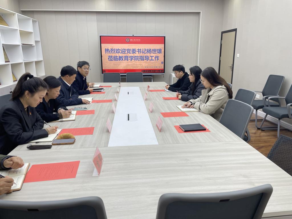 在认真听取汇报后,杨世雄对教育学院成立三年来取得的成绩给予充分肯定。他指出,教育学院办学思路清晰、定位精准,班子团结务实,师生精神面貌积极向上,在党的建设、人才培养、教学改革、社会服务等方面亮点纷呈。