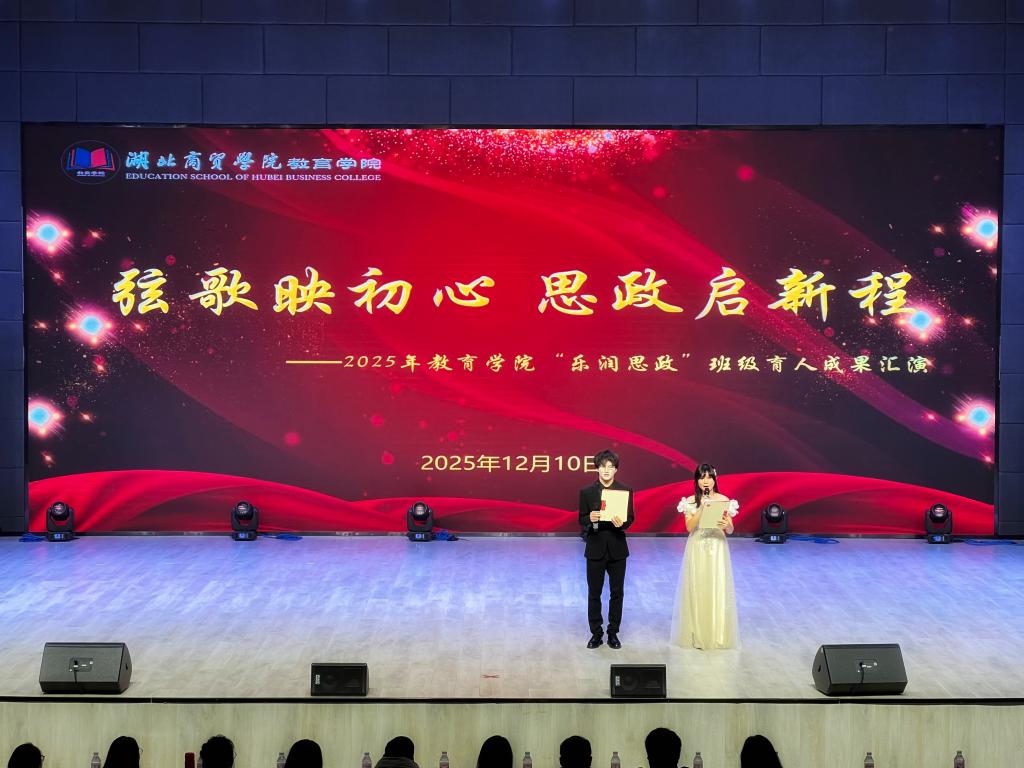 12月10日,教育学院咸宁校区举办的“弦歌映初心·思政启新程”2025年度“乐润思政”班级育人成果汇演圆满落幕。此次活动,校团委副书记徐辉、各二级学院党总支副书记、辅导员以及学生代表出席观看。此次汇演不仅是班级育人成效的集中展现,更是学院以党建带团建、以团建促思政实践成果的一次生动呈现。