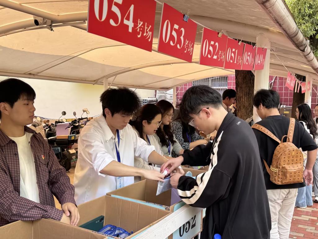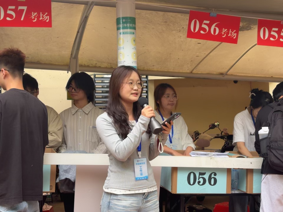 与此同时,学院组织的学生志愿者团队也忙碌在考点周围。他们分工明确,有的在路口引导考生快速找到考场位置,有的协助维护入场秩序,还有的为考生提供备用文具、纸巾、饮用水等应急物品。一位志愿者同学表示:“去年学长学姐也是这样为我们服务的,今年轮到我们为学弟学妹们护航,感到非常有意义。”在辅导员和志愿者的共同守护下,考生们有序入场,神情从容而坚定。