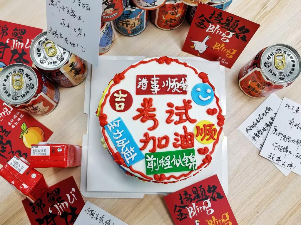 学院为每一位专升本考生准备了别出心裁的“上岸”饮料和“考试加油”甜蜜蛋糕。“上岸”饮料寓意考生成功圆梦本科,“考试加油”蛋糕则寄托着金榜题名的美好期许。每一份礼物上都贴着由师生亲手设计的祝福贴纸,“升本必胜”“未来可期”“前程似锦”等话语传递着来自学院大家庭的力量。