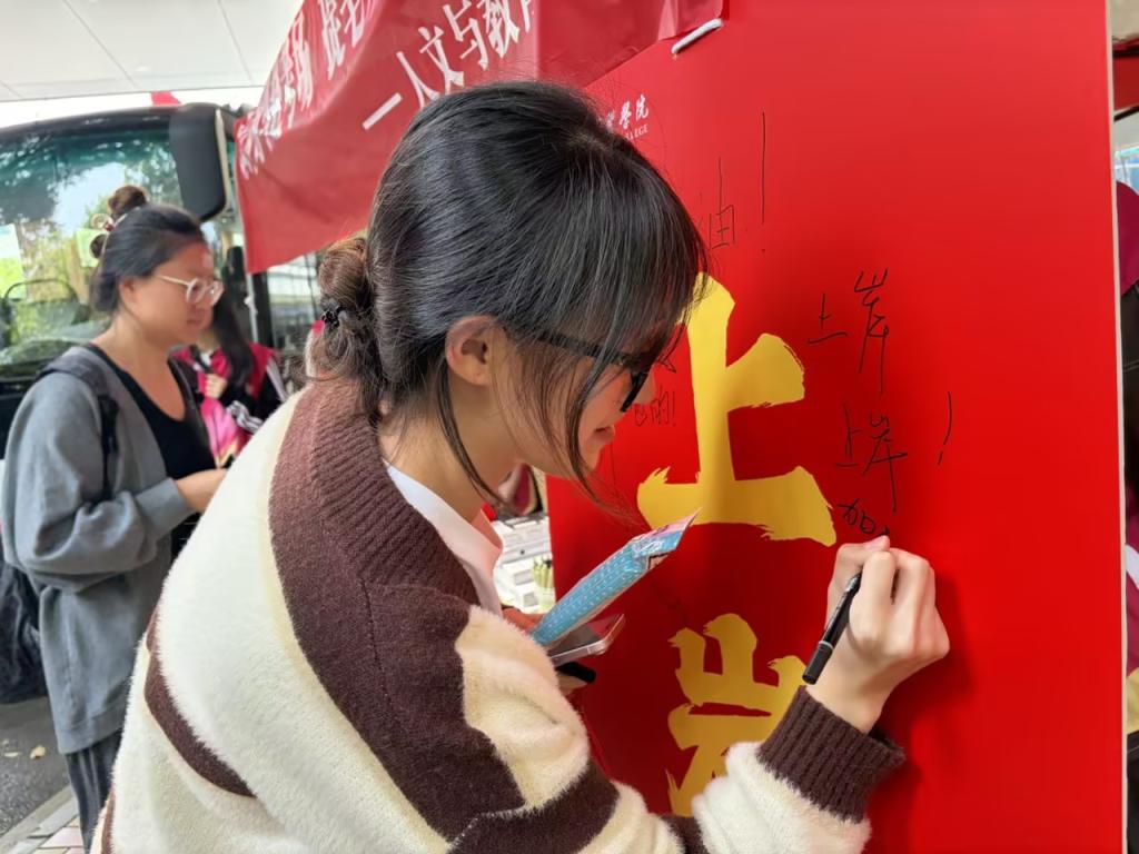 活动现场还设置了一块印有“上岸”字样的宣传板,考生们纷纷签名留念。一个个名字写在“上岸”二字周围,仿佛许下了关于未来的美好承诺。签名过程中,同学们互相鼓励、彼此祝福,现场洋溢着积极向上的氛围。