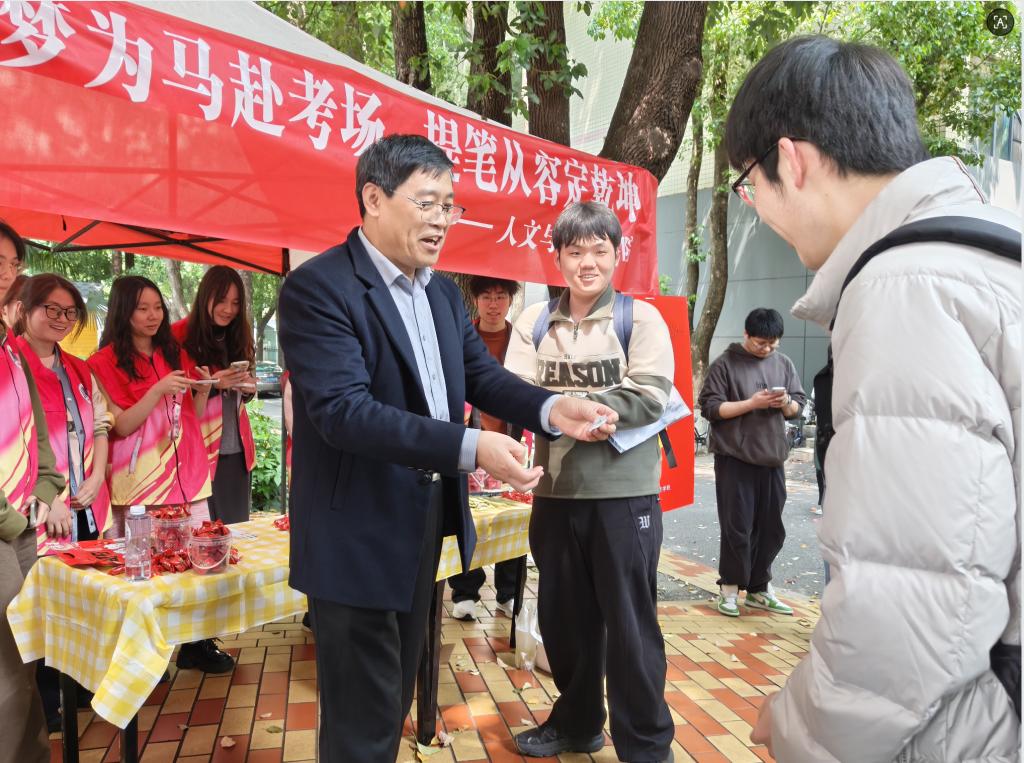 4月17日清晨6点,武汉校区考点外已是一片温暖景象。人文与教育学院的辅导员们早早来到现场,为每一位步入考场的考生送上最后的叮咛与鼓励。“放平心态,你们已经准备得很好了”“认真审题,相信自己”……一句句朴实而温暖的话语,让紧张备考的学子们倍感踏实。