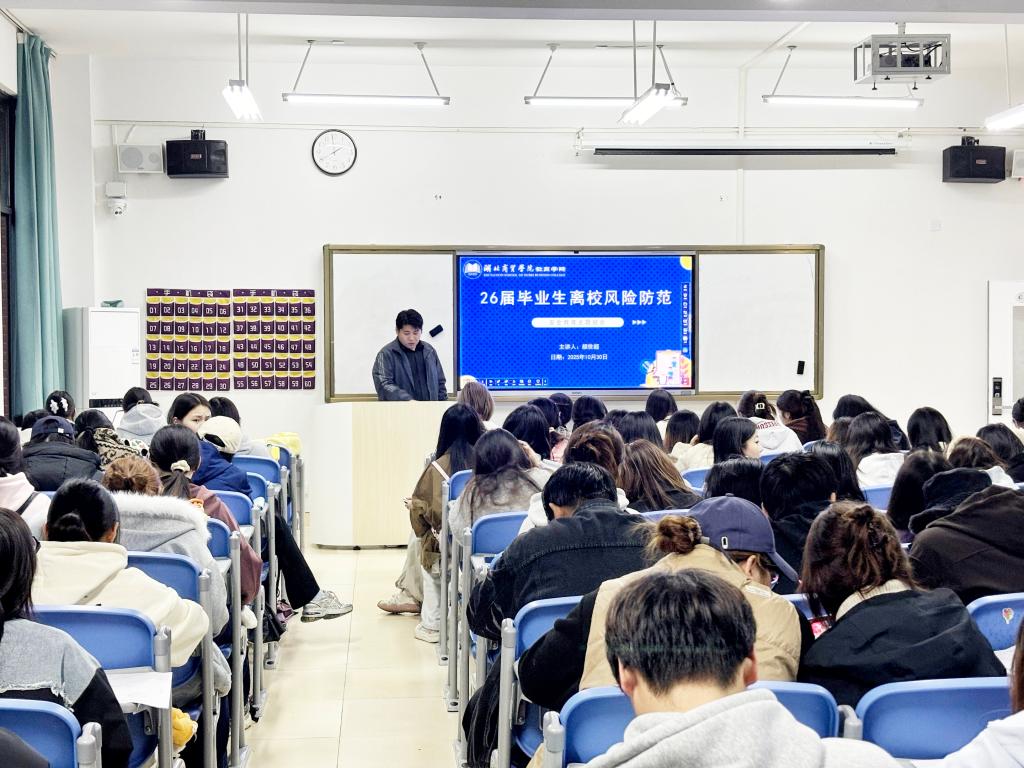 为切实保障2026届毕业班学生顺利离校开展实习、就业工作,强化学生安全防范意识与权益保护能力,10月28日至30日,教育学院辅导员张香湘、颜世超分别面向所带毕业班学生,陆续开展离校安全教育主题班会,为即将踏上人生新征程的学子们送上“安全锦囊”与暖心关怀。